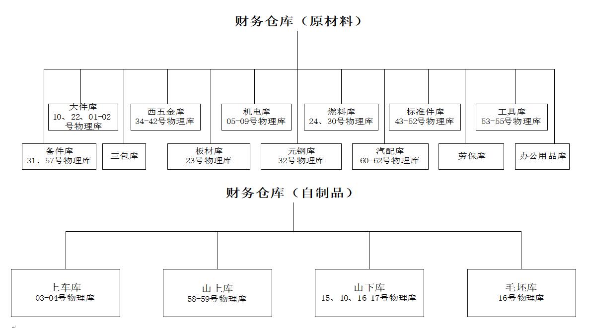 子库的设置原则是:易于查询各种物料的数量及其统计,方便对工作中心的考核。目前实际共有63个子仓库,主要由物管处管理;财务目前将之分为大件库、西五金库、机电库、燃料库、标准件库、工具库、备件库、三包库、板材库、元钢库、汽配库、劳保库、办公用品库、上车库、山上库、山下库、毛坯库,共17个仓库,具体情况如下: