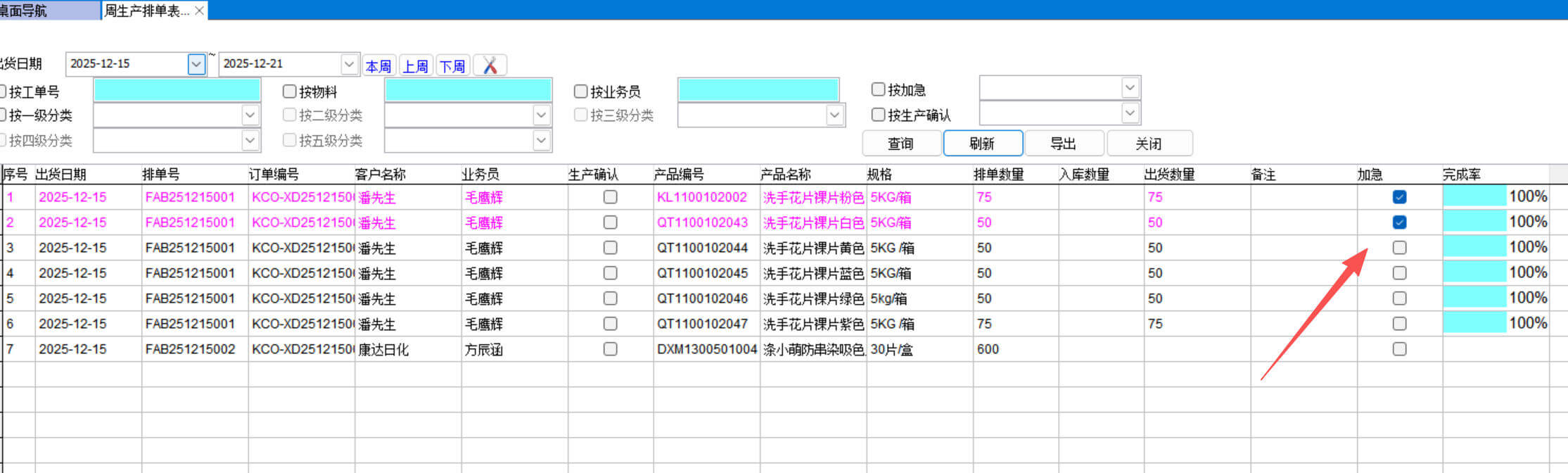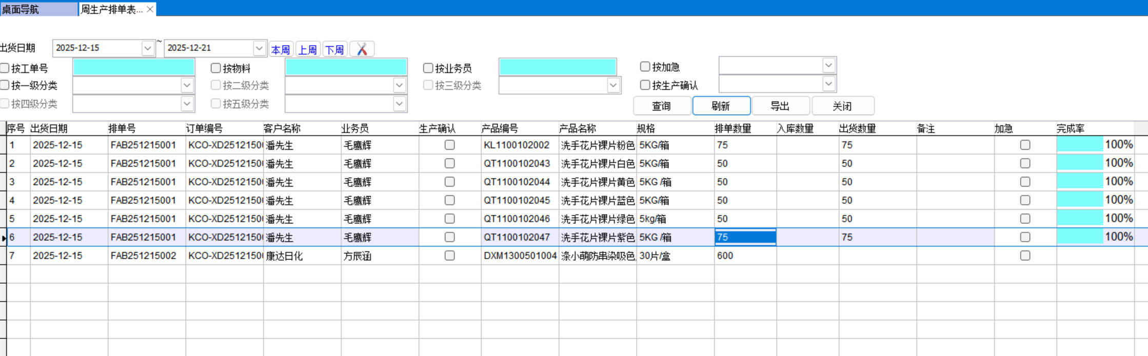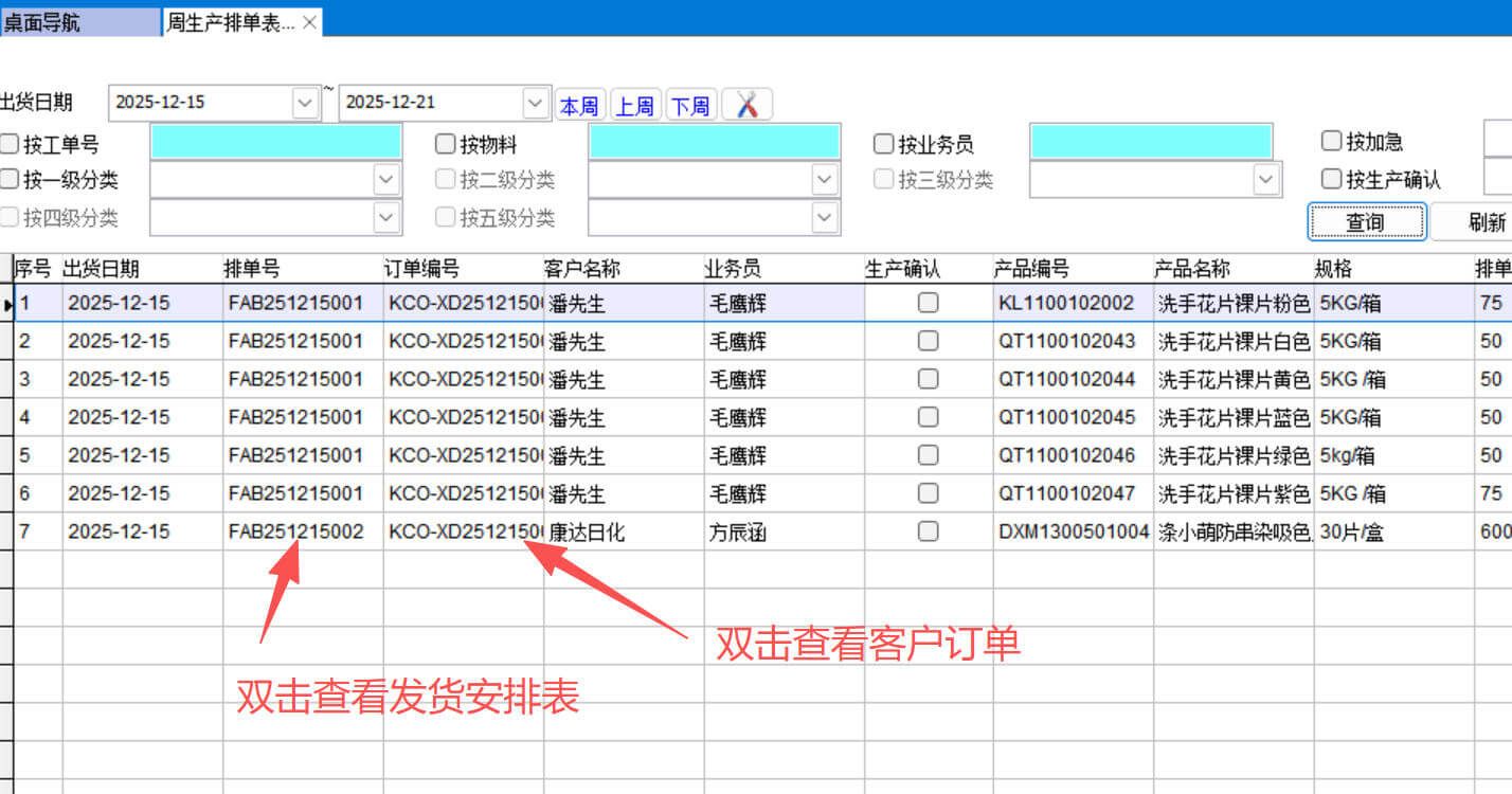 周生产排单表的起点是发货安排表,只有做了发货安排表才会在周生产排单表中显示