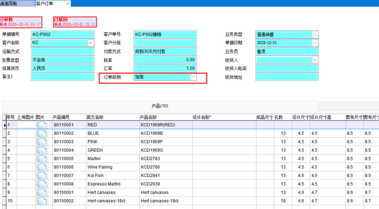销售部门点加急后字体变成红色,客户订单也会变成加急