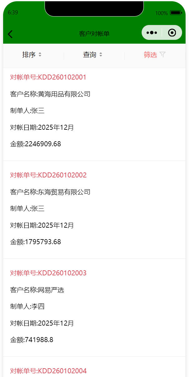 总结:客户对帐单是在PC端ERP中建立,数据实时同步到手机端,用手机查看客户对帐单是方便移动用户快速浏览、审批客户对账单