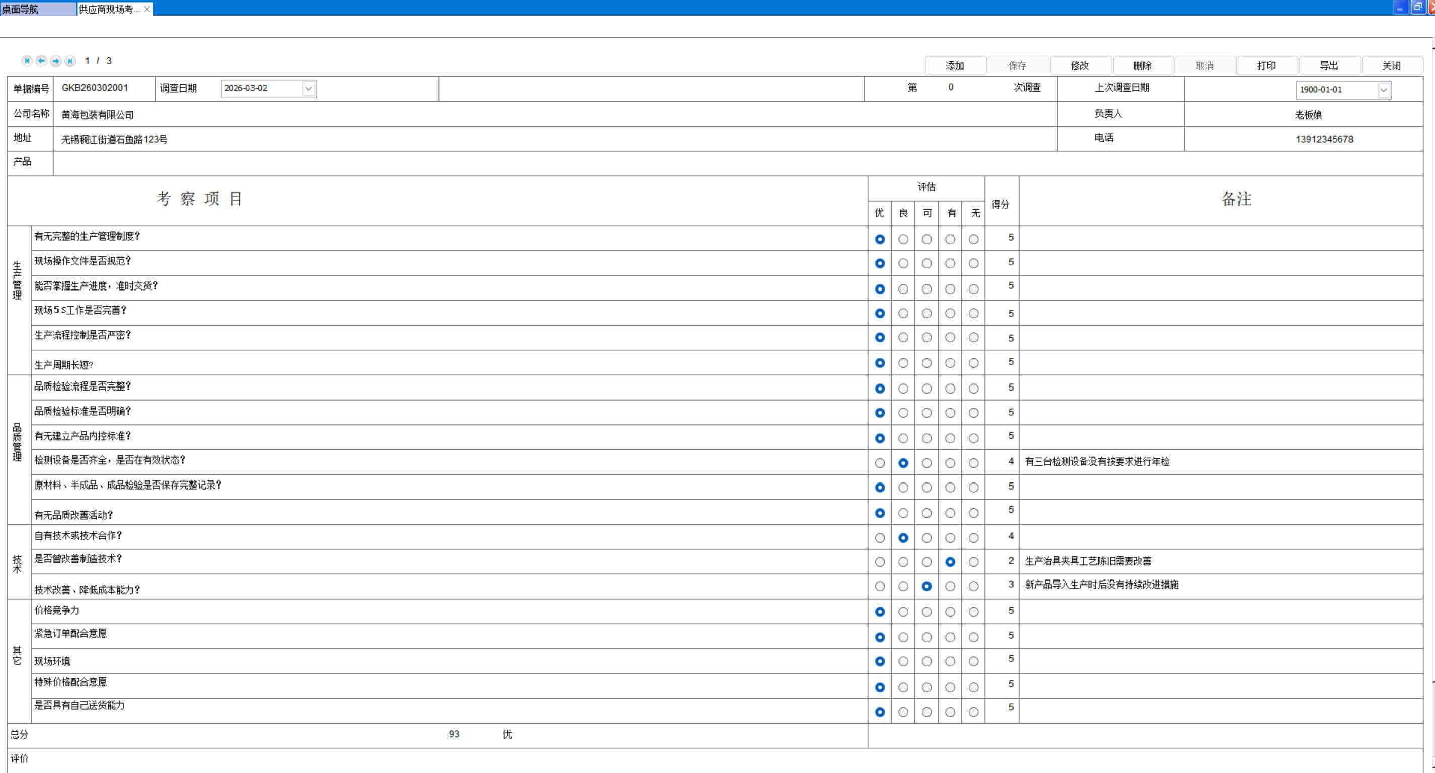 打开路径:【主菜单】-【采购】-【供应商评审】 -【供应商现场考察表】