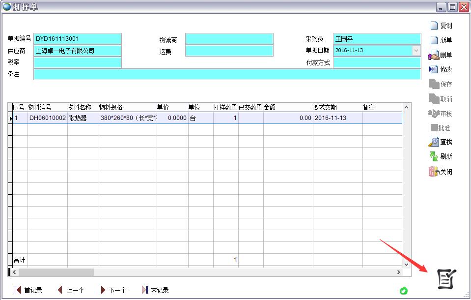 打开路径:【主菜单】->【采购】-> 【打样单】->点右下角